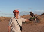 Back at base we had a demo by a guy who trains Peregrine Falcons After we all got to pose with the birds he had the falcon fly to catch a tethered lure that had some chicken attached. That was the birds dinner. He used a small GPS device on the bird and a phone app to measure its speed; today 85km/h. This breed of bird has been clocked at 240km/h when attacking in a vertical dive.