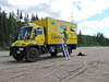 Heading out of Baie-Comeau north to cross the 50th and 51st parallels today we got an abrupt introduction to northern roads. The first 60km was marked by one of the roughest sealed roads we have ever driven and one that twisted around small lakes with almost continuous short but steep (10-12%) climbs and descents. Fortunately the road improved after 60km. Hydro power is the other signature feature of this road. Large power line towers march beside the road as far as the 200KM where sits the 5th hydro station of the day Manic 5. These power stations get their name from the Manicouagan River which in turn is fed by the Manicouagan Reservoir a large circular lake clearly discernible on a map, this is the 5th largest meteor crater in the world.
