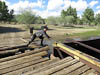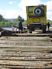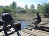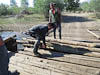 As we drew up to the river bank we both saw (and exclaimed) at the same time - "there is a ferry" - and so there was. But what a ferry it was - two rusting steel boat hulls (you could not call them boats as they had no decks) connected together by some steel girders topped with a layer of tree trunks for decking. The loading ramps were similarly constructed with a steel ramp frame decked with more tree trunks. The vessel had no power and how it managed to cross the river I will describe a little later but the thing that struck me while I sat there waiting to board/load was the way the crew pulled the vessel tight up against the loading ramp. They used an improvised capstan made from an axle shaft (welded to the vessel in a vertical orientation). Around the axle shaft was a section of steel pipe, a steel cable (with a loop in the end) was stretched from the loading ramp, wound around that piece of tube, another piece of steel (to be used as the capstan handle) was passed through the cable loop and then one of the crew wound the handle around and around tightening the cable. Simply amazing.