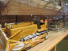 • The third display is not really traditional Sami but more like 1950's 1960's arctic transportation of heavy goods before the construction of roads. It was a model of a cat-dozer train. It is a train of large heavily loaded wooden sleds being pulled by a Cat bull dozer. The model showed a special enclosed and heated sled presumably for goods that could not be allowed to freeze as well as a sled carrying a sleeping hut for the crew. An accompanying map indicated that there was quite an extensive network of routes being supplied by these trains.