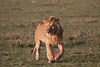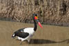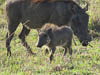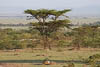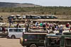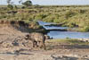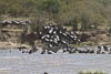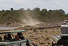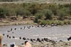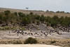 Throughout the rest of the morning we had a number of interesting sightings, more lions, one pride with cubs, lots of wart hogs, and a saddle beaked stork with a yellow "saddle" in its other wise red and black beak. We eventually decided to follow a large herd of wildebeests that seemed like they might make a crossing of the Mara River. So along with a couple of dozen other safari vehicles we watched, waited and occasionally repositioned ourselves in anticipation. Eventually we were rewarded with a crossing of perhaps 3000 animals. Really quite exciting.