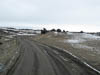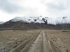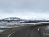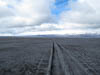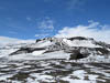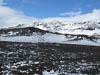 The snow was gone in the morning, at least at our elevation, but all around us the black mountains were covered in a fresh layer of white. Not deterred we continued south of F88 slowly gaining a little altitude so that by about 10:00 am we were high enough to be back in the white so we stopped (on the road) for breakfast and to take in the surreal scene. Within a few minutes of getting underway again we met a lady ranger (going the other way) and got the now standard lecture about "no off road driving" but also some advice and a pamphlet about a recent lava flow (2014).