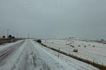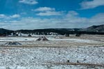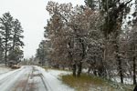 It was cold this morning, 20°F, and still snowing lightly. Overnight our diesel heater had (again) stopped working and this time I could not get it restarted. Fortunately we are in a campground with electricty so we can still heat the camper and truck engine or maybe we would be here another day. Putting aside the vehicle troubles the morning was really pretty. About an inch of snow covering most everything yet clouds high enough that we could see the Devil's Tower also with a light snow cover. We quite enjoyed our stay at Devil's Tower KOA.